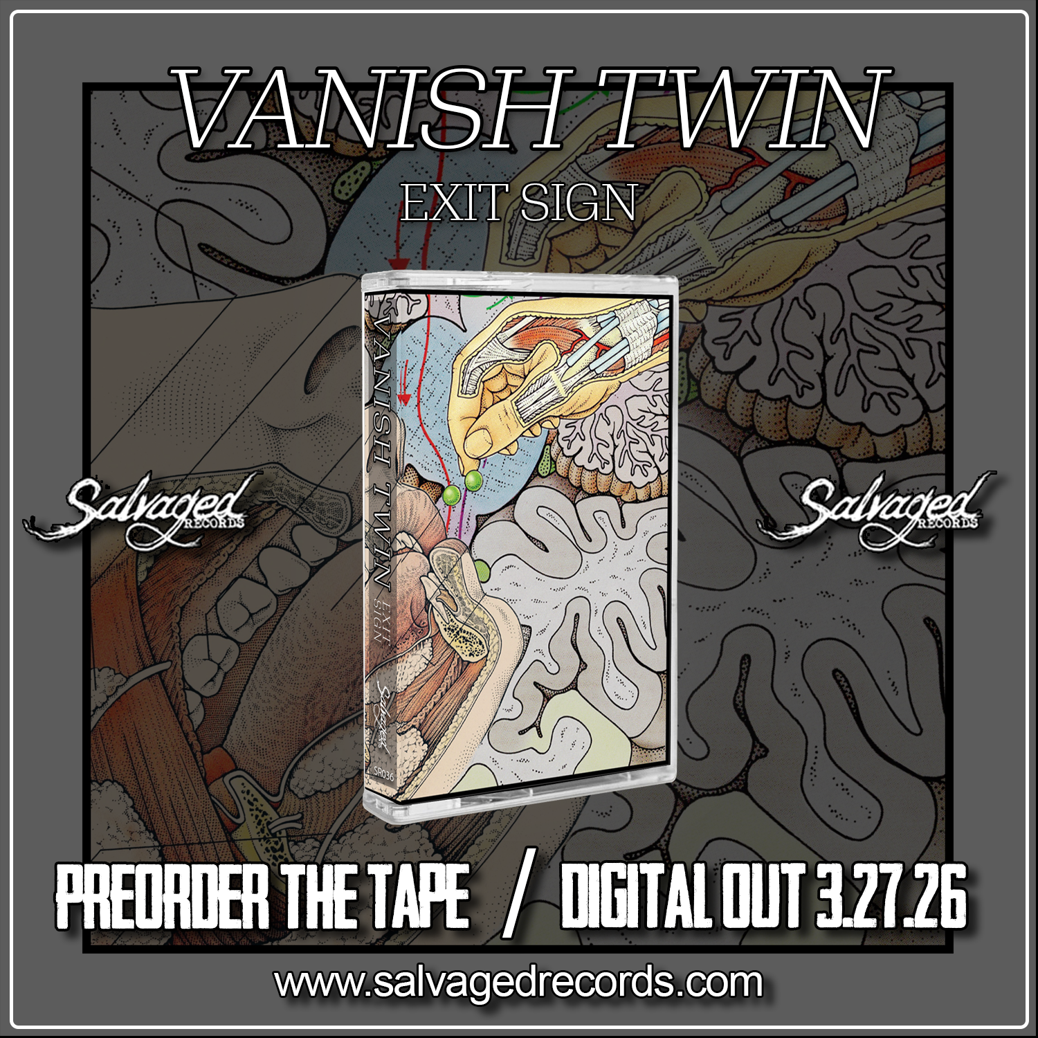 We are releasing on cassette the brand new "Exit Sign" LP from Jacksonville, FL's Vanish Twin!! The record will be out digitally 3/27/26 and cassettes will be shipping by the end of March. Engineered/mixed/mastered by John Howard (Ecostrike, Magnitude, Leaving Time) at War House Recordings in Gainesville, FL. Limited to just 40 copies total: 20 on pink (band exclusive) and 20 on clear!